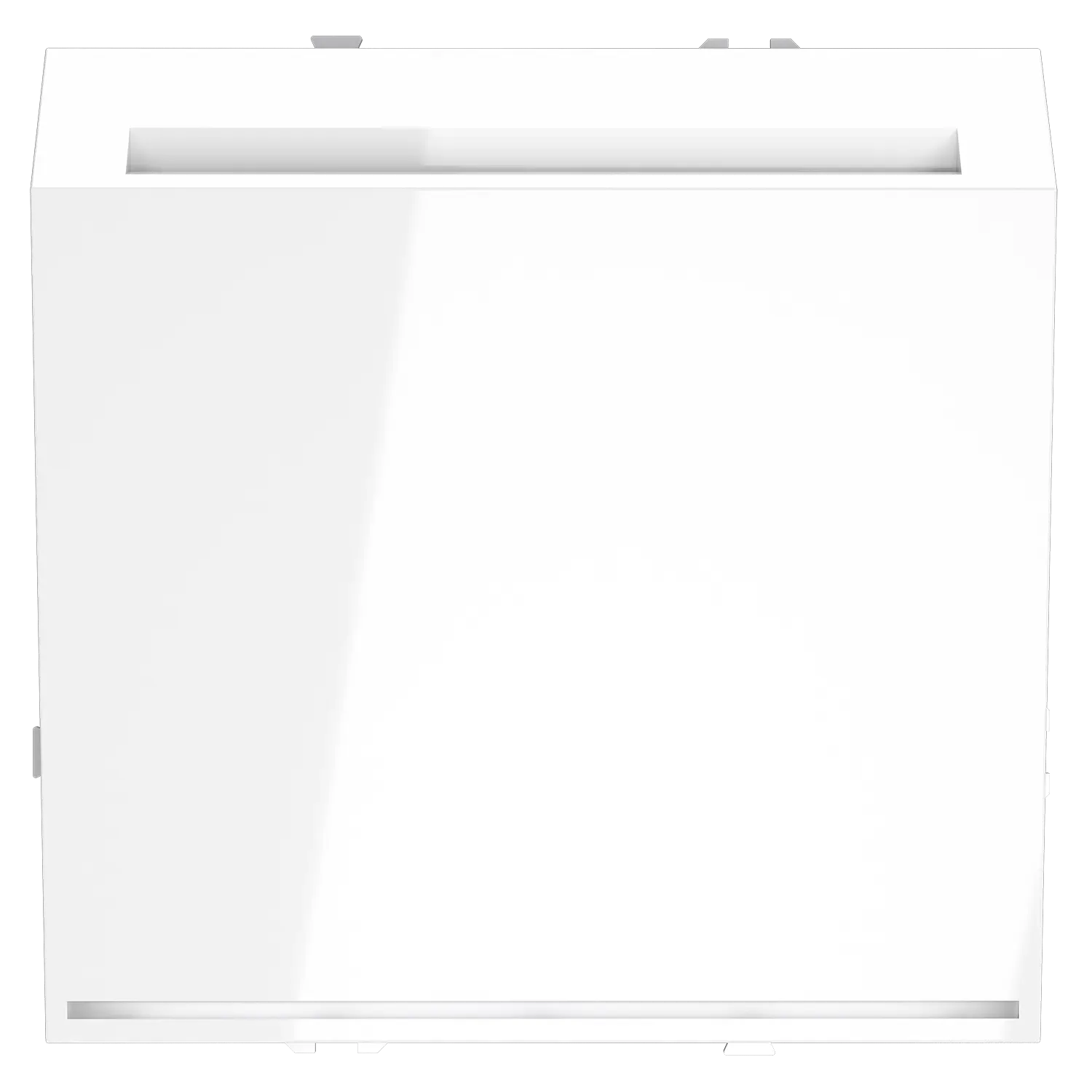 • Белый глянец без изъянов — покрытие Soft touch сохраняет блеск без царапин и отпечатков пальцев. На светлых стенах сливается в единую текстуру, на тёмных — становится аккуратным графичным акцентом. Габариты 70,8 × 70,8 мм идеально вписываются в стандартные подрозетники.